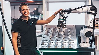 Wir konzentrieren uns hauptsächlich darauf, den Kunden zu entlasten. Wenn spezielle oder komplizierte Produkte bearbeitet werden müssen oder einfach nur ein bisschen mehr Sorgfalt erforderlich ist, können wir helfen und mitdenken. Das ist es auch, was unsere Arbeit so interessant macht, es geht wirklich um Technik. So können wir den Cobot für den Kunden ganz individuell gestalten.