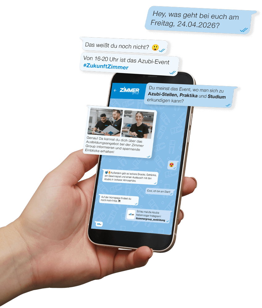 Das Azubi-Event am 24. April ist dein Weg zu uns! Streich dir diesen Tag jetzt fett im Kalender an! Unsere Ausbilder*innen und Azubis stehen dir Rede und Antwort und geben dir einen Überblick über unsere Ausbildungsstellen, duale Studiengänge und Praktika. Außerdem führen wir dich durch unseren Betrieb und zeigen dir exklusiv unsere brandneue Ausbildungswerkstatt. Lass dir den Blick hinter die Kulissen nicht entgehen!