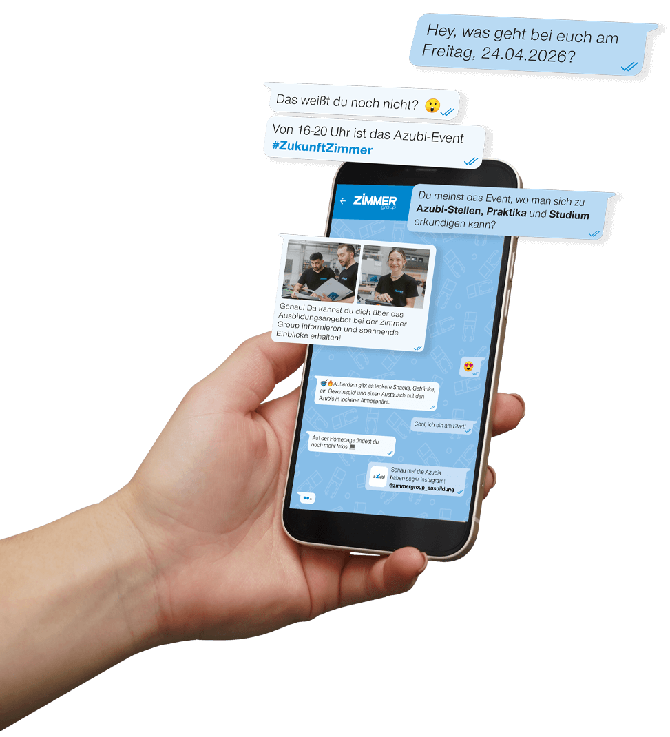 Das Azubi-Event am 05. April ist Dein Weg zu uns! Streich Dir diesen Tag jetzt fett im Kalender an! Unsere Ausbilder*innen und Azubis stehen dir Rede und Antwort und geben Dir einen Überblick über unsere Ausbildungsstellen, duale Studiengänge und Praktika. Außerdem führen wir Dich durch unseren Betrieb und zeigen Dir exklusiv unsere brandneue Ausbildungswerkstatt. Lass Dir den Blick hinter die Kulissen nicht entgehen!