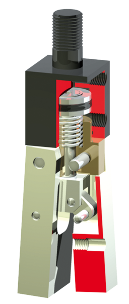 molla integrata nel cilindro come riserva di forza (nel cilindro a semplice effetto serve per il ritorno in posizione) - Meccanismo a leva a comando forzato